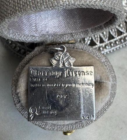 Sterling .925Marriage License Charm2.94 gramsVintage PreownedCondition good with minor surface wear Monogrammed on reverseBox shown not included, Nicely packaged
