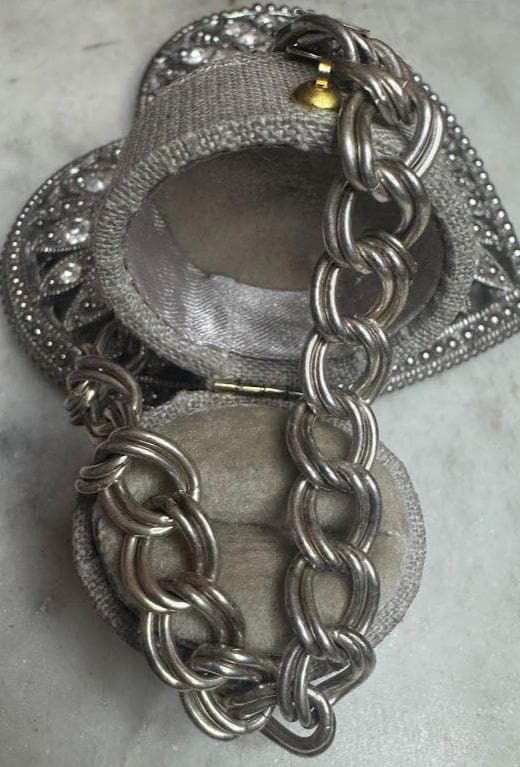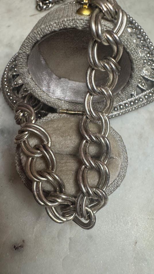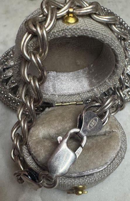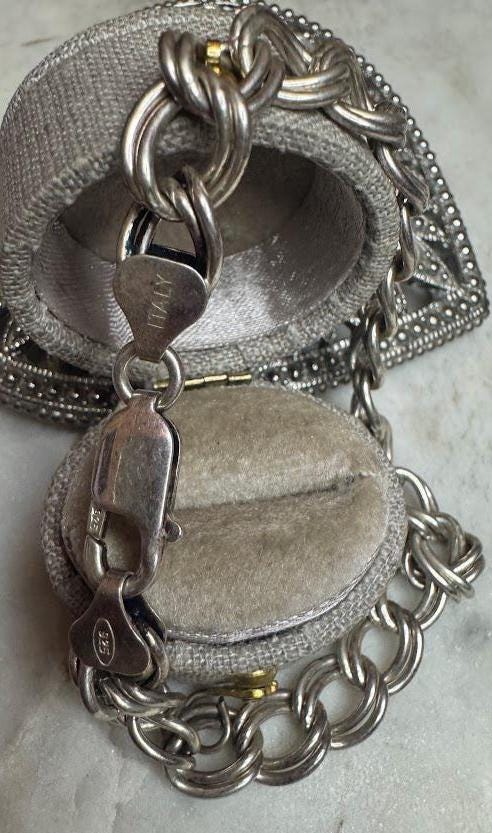 Sterling Silver .925 Charm BraceletDouble link Lobster Claw Clasp 7in length14.85 gramsVintage, Pre-ownedCondition excellent with minor surface wearBox shown not included, Beautifully packaged