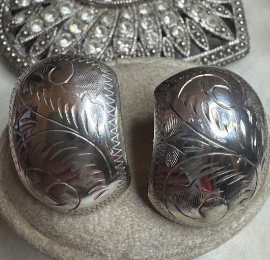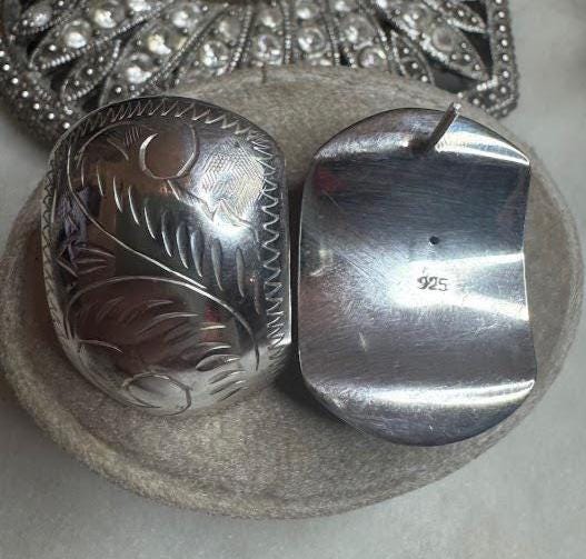 Sterling .925 Curved Design with Designer EtchingsPost earring post6.26 gramsVintage Pre-ownedCondition Excellent with minor surface wearBox shown not included, Nicely packaged with 100% recycled material