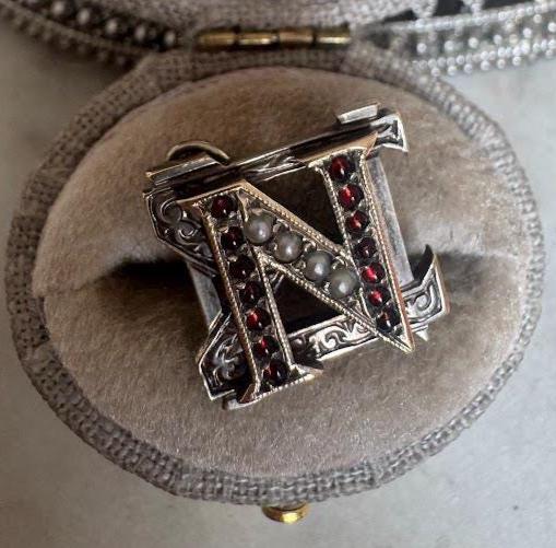 14kt White Gold Garnet & Seed Pearls Accent Stones4.57 gramsVintage, Pre-owned Condition Good with minor surface wearBox shown not included, Beautifully packaged with 100% recycled materials