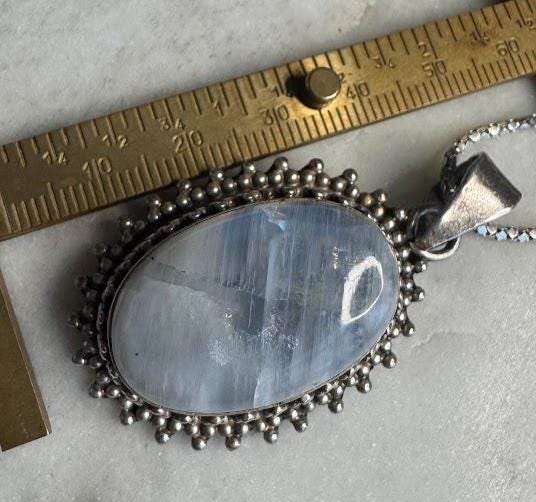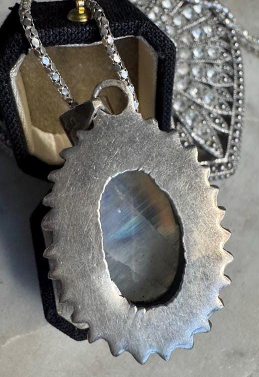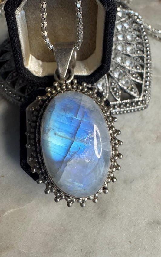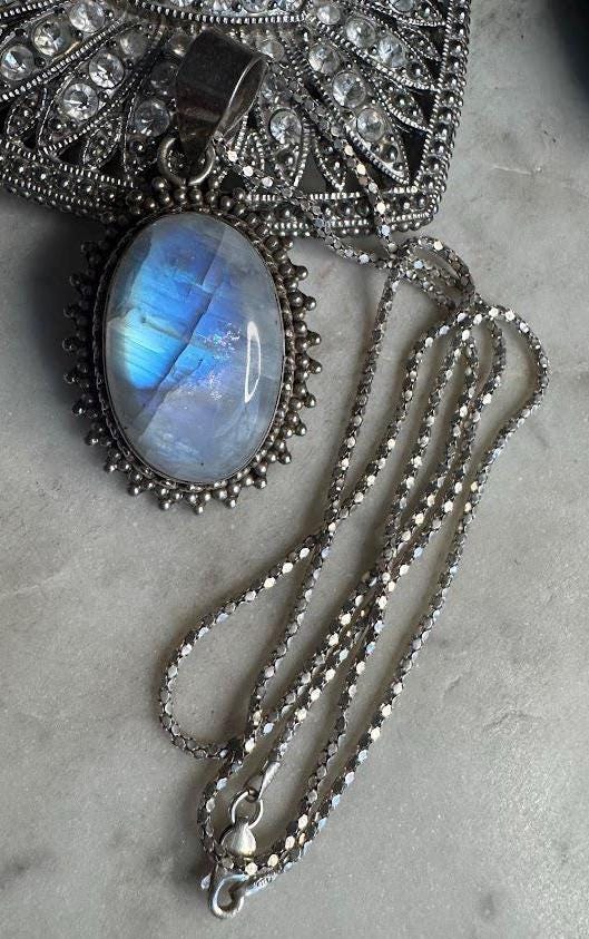 Sterling .925 Moonstone Center StoneMirrored Link Chain 18 length27.70 gramsVintage Pre-ownedCondition excellent with minor surface wearBox shown not included, Beautifully packaged with 100 recycled materials