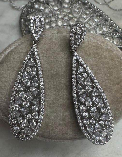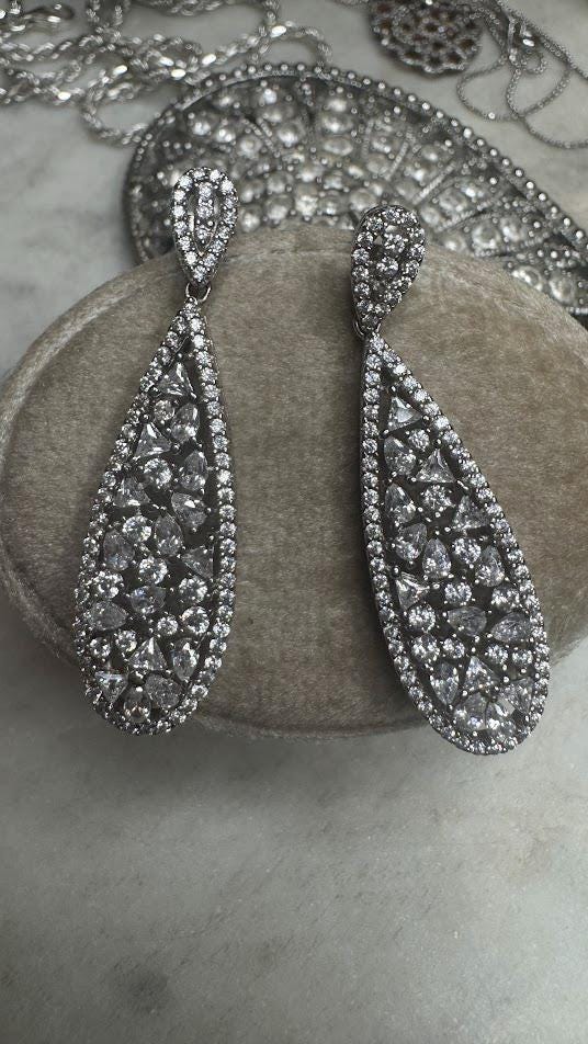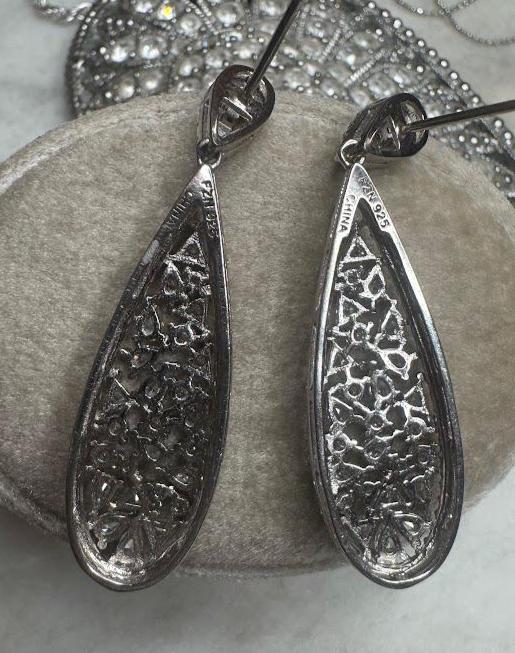 Silver .925Cubic Zirconia Stones Marquis, Round, TrillionPost pierced earring6.20 gramsPre-ownedCondition excellent with minor surface wearBox shown not included, Beautifully packaged with recycled items