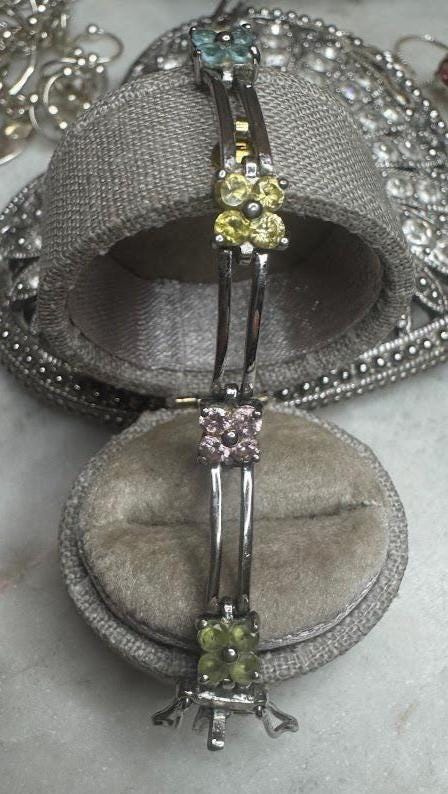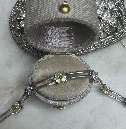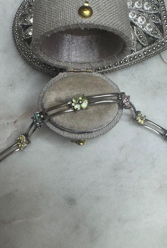 Sterling Silver .925Flowered Gemstones Pink CZ, Peridot, Blue TopazBox Link clasp 7.5 in length7.08 gramsVintage, Pre-ownedCondition excellent with minor surface wearBox shown not included, Beautifully packaged