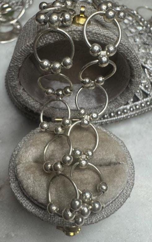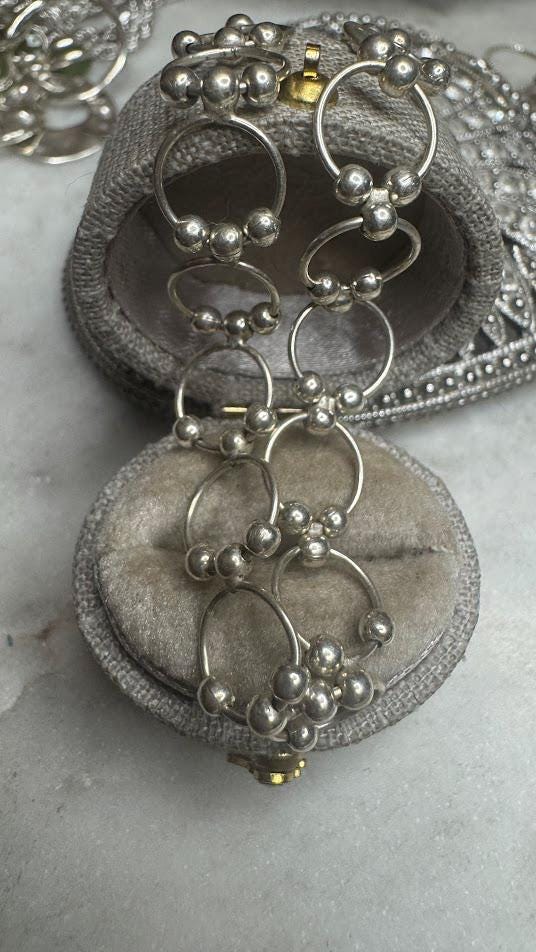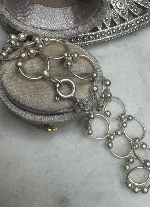 Sterling Silver .925Beaded Circle DesignLobster Claw clasp 7.5 in length5.38 gramsVintage, Pre-ownedCondition excellent with minor surface wearBox shown not included, Beautifully packaged