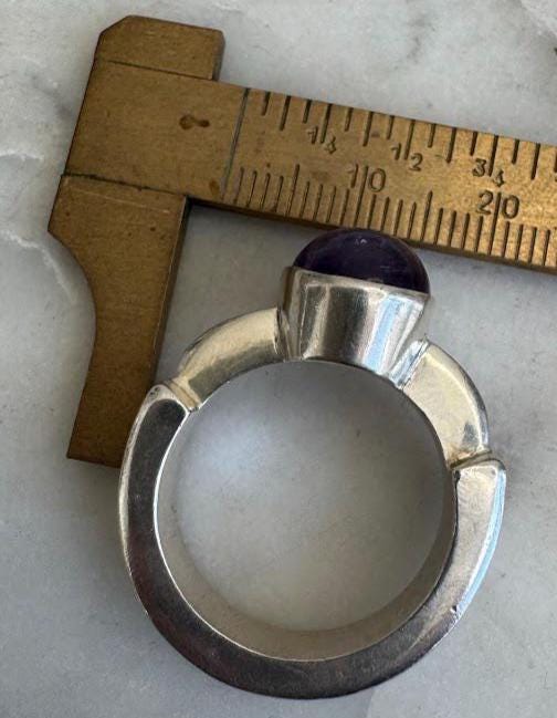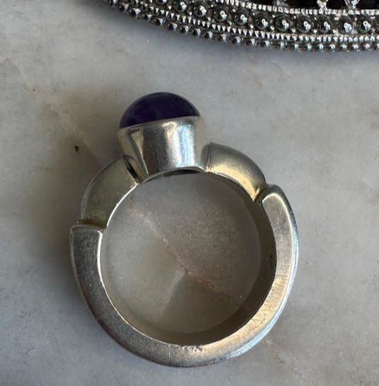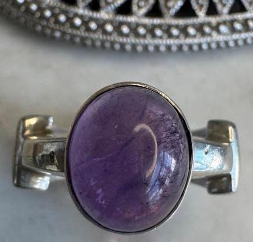 Sterling .925Amethyst Oval Center 13.96 gramsSize 8.25 Vintage, Pre-ownedCondition Good with minor surface wearBox shown not included, Beautifully packaged with 100% recycled material