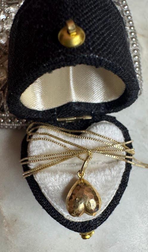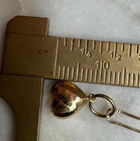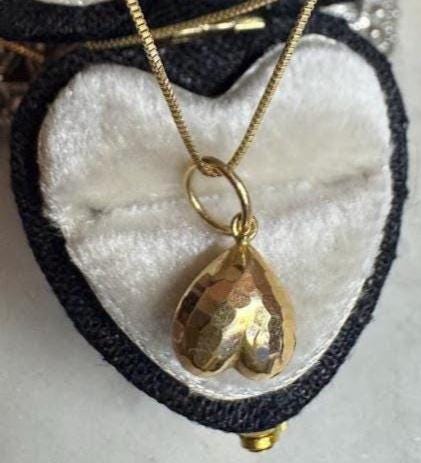 14 kt Yellow Gold Upside Down Diamond Cut Heart PendantBox link chain 18in Spring ring clasp1.29 gramsPre-ownedCondition good with minor surface wear, Nicely packaged with 100% recycled material