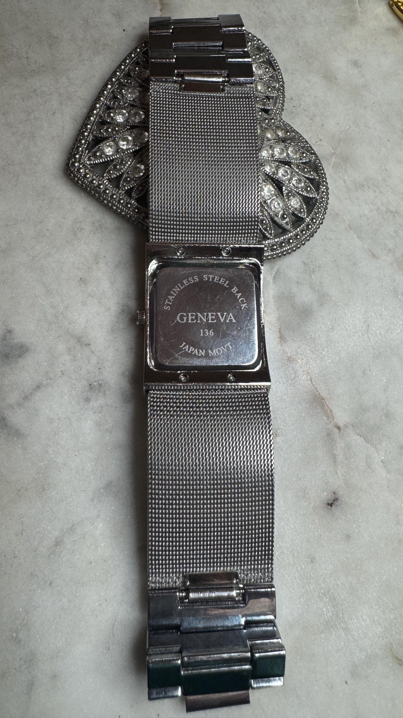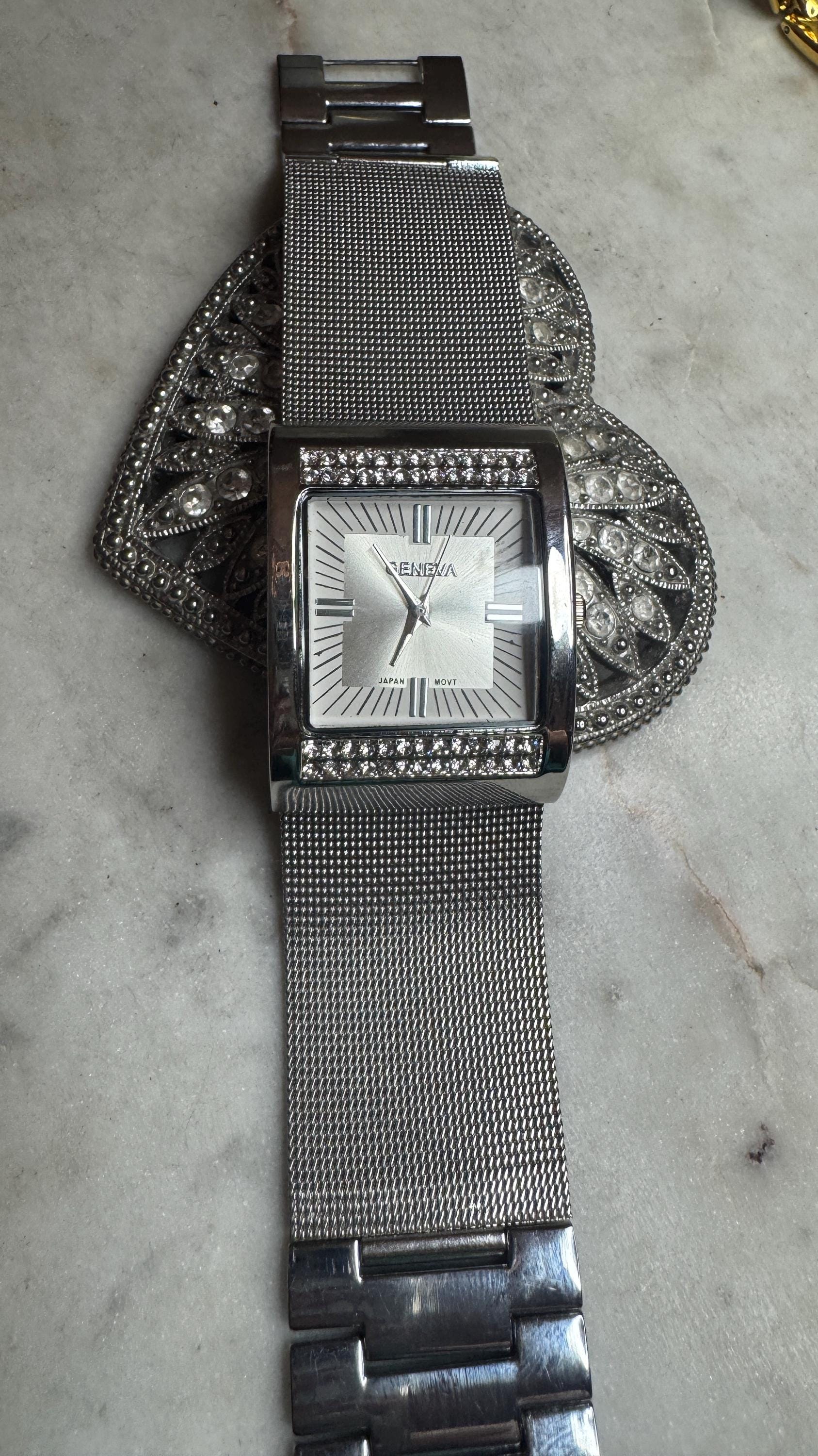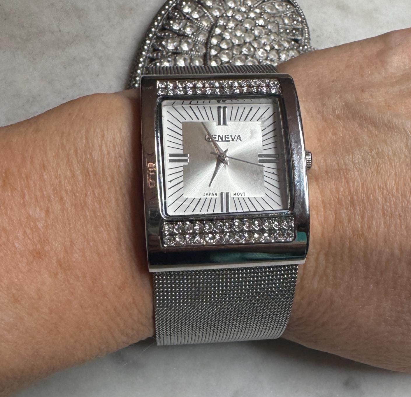 Sterling .925 Silver Mesh & Rhinestones Watch76.73 grams2.5in widthVintage, Pre-owned NEW BATTERYCondition excellent with minor surface wear-BARELY OR NEVER WORNBox shown not included, Beautifully packaged with 100% recycled materials