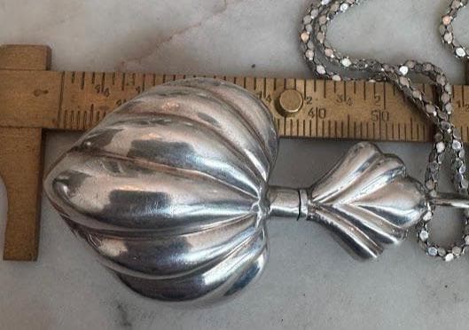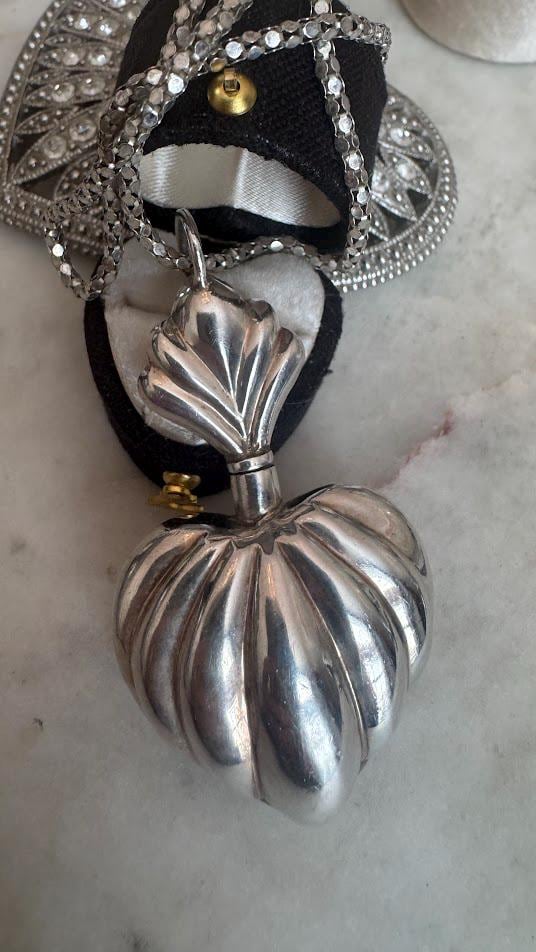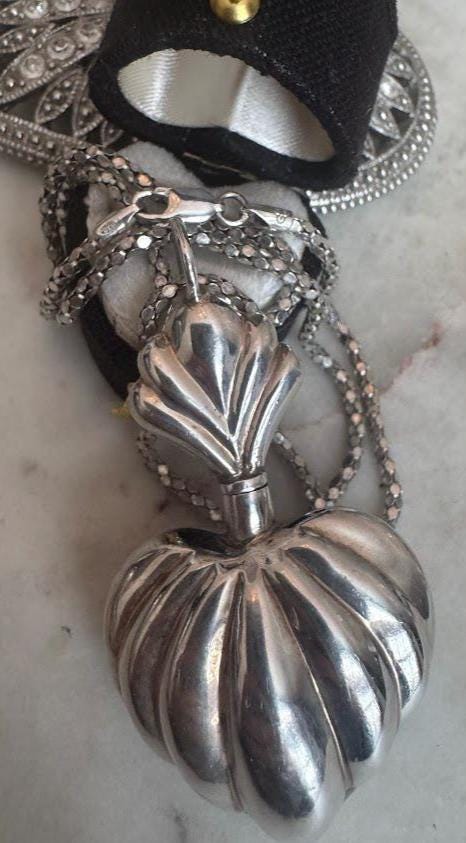 Sterling.925Polished Heart Pendant with Perfume TopperMirrored Box chain 18in 16.33 gramsVintage Pre-ownedCondition good with minor surface wearBeautifully packaged with 100% recycled material
