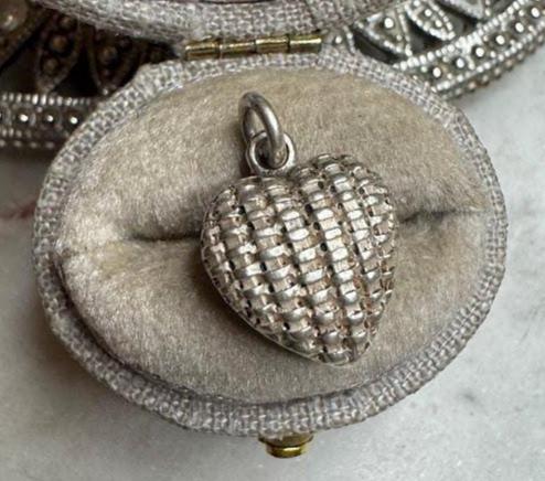 Sterling .925Basket Weave Heart Charm Pendant2.57 gramsCondition excellent with minor surface wearAntique, Vintage, Pre-ownedBox shown not included, Beautifully packaged with 100% recycled material