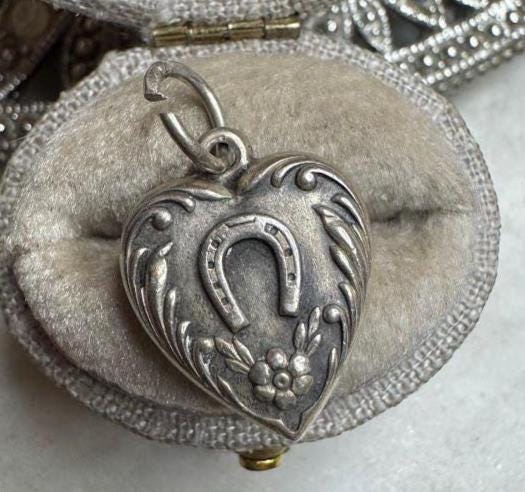 Sterling .925Heart Horse Shoe Charm1.46 gramsAntique, Vintage, Pre-ownedCondition good with minor surface wearBox shown not included, Beautifully packaged with 100% recycled material