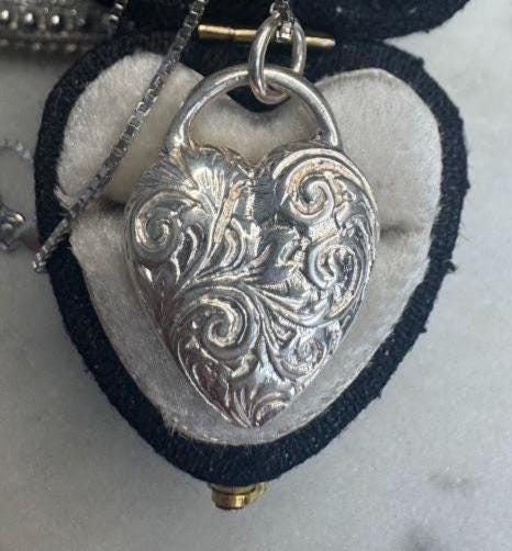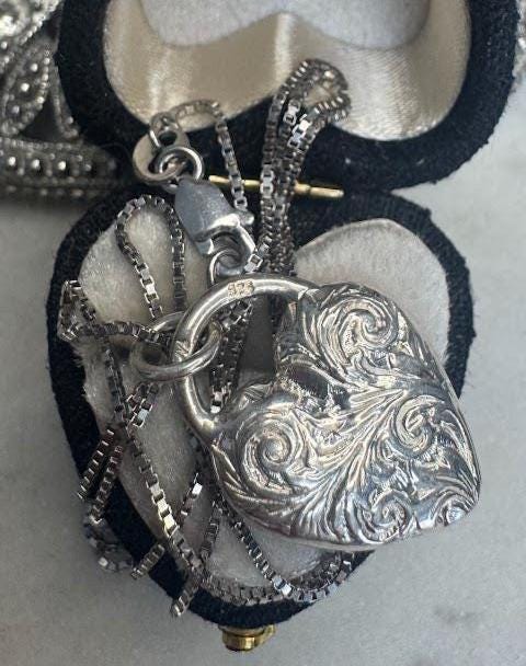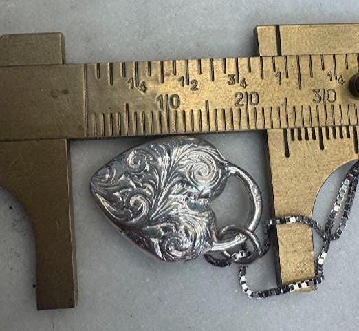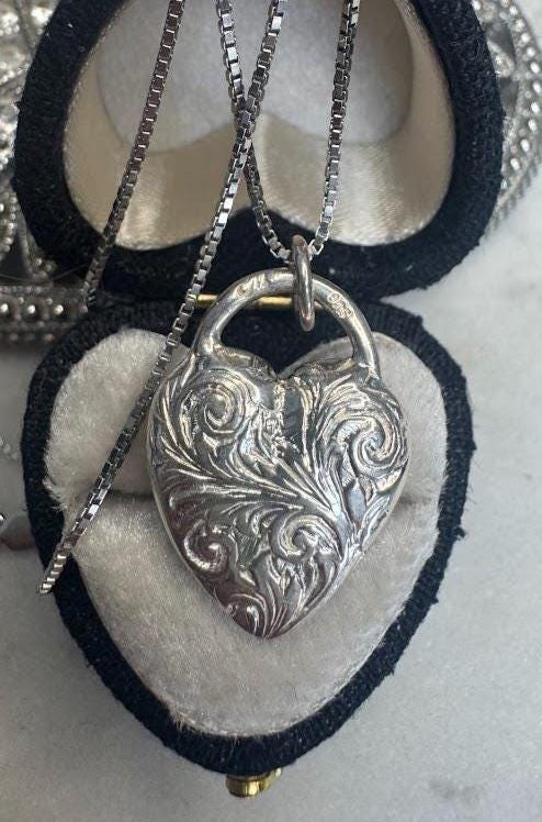Sterling .925 Floral Design Heart PendantBox link chain 18inLobster claw clasp8.42 gramsCondition excellent with minor surface wearBox shown not included, Nicely packaged with 100% recycled material