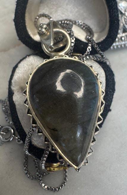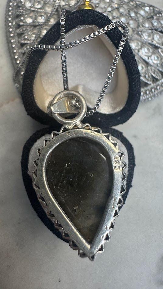 Sterling .925 Labradorite Center StoneBox link chain 18inSpring ring clasp10.84 gramsVintage, Pre-owned Condition good with minor surface wearBox shown not included, Nicely packaged with 100% recycled material