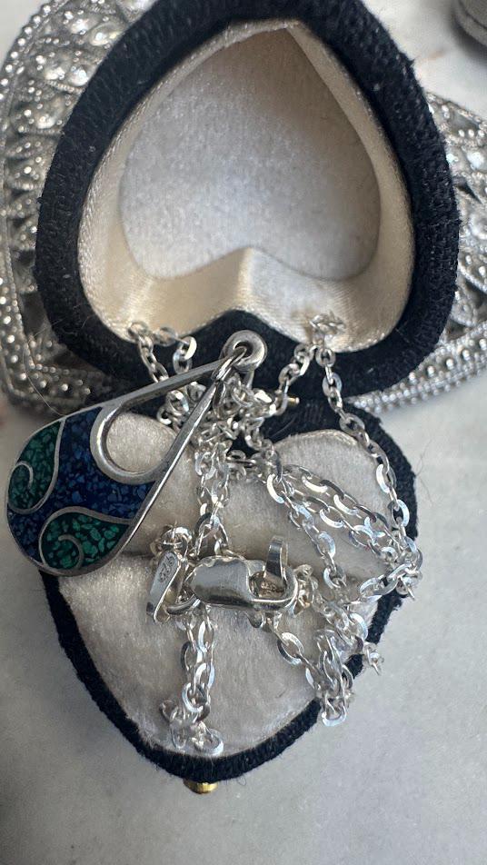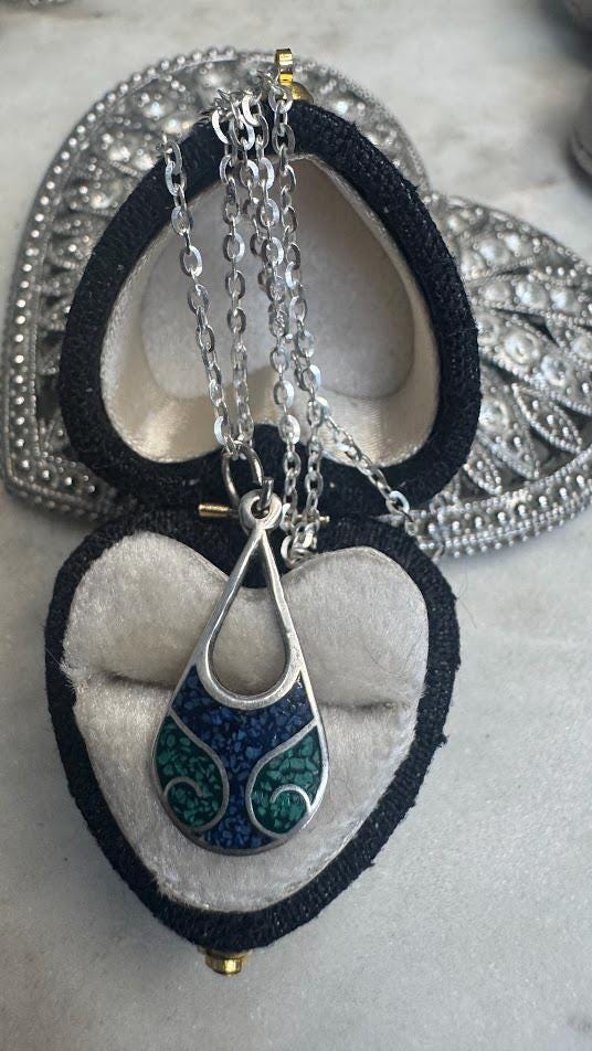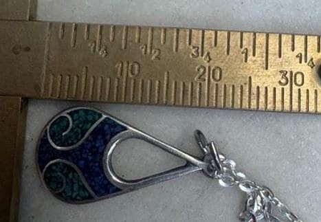 Sterling .925 MexicanTurquoise & Lapis Inlaid StonesCable Link Chain 16in Rhodium PlatedLobster Claw Clasp2.44 gramsVintage, Pre-owned Condition good with minor surface wearBox shown not included, Nicely Packaged