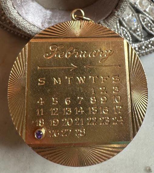 14kt Yellow GoldFebruary 25th Calendar Pendant CharmAmethyst Center Stone10.37 gramsVintage Antique Pre-owned Condition Good with minor surface wear Box shown not included, Beautifully packaged with 100% recycled material