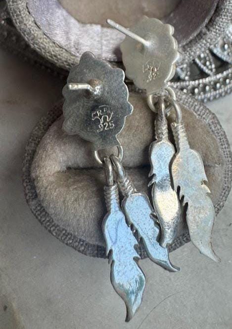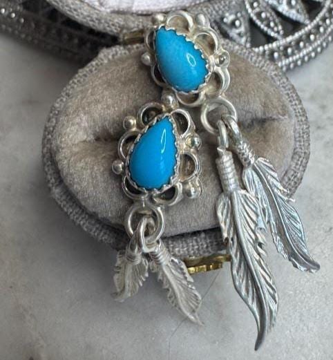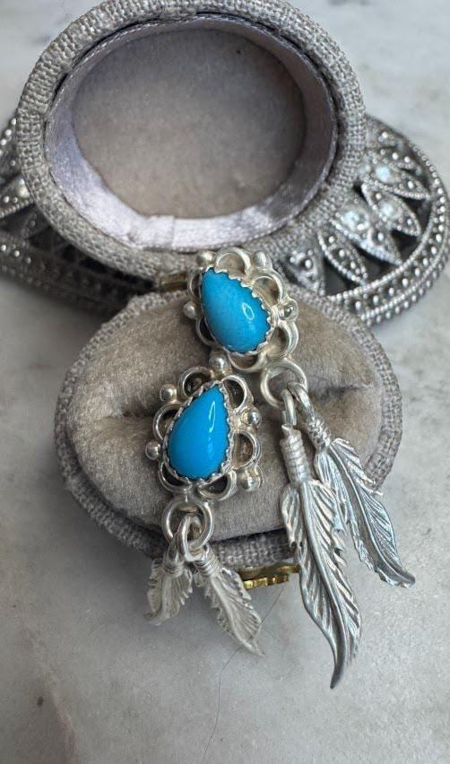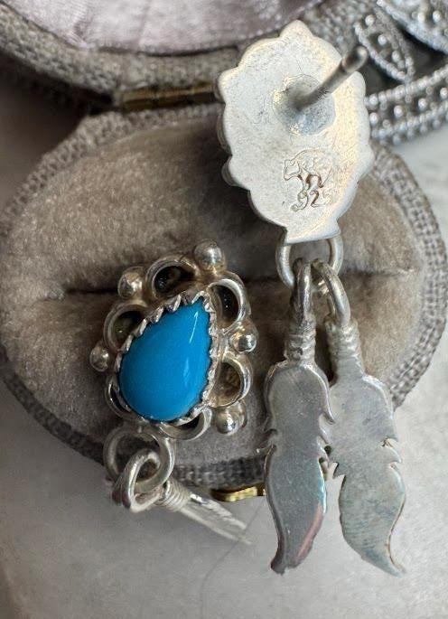 Sterling .925 Turquoise Center StonesPost Pierced Earring4.00 gramsVintage, Pre-owned Hallmarked Running Bear ArtistCondition good with minor surface wearBox shown not included, Nicely packaged with 100% recycled material