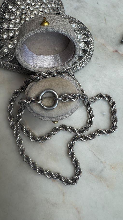 Silver .850 Unmarked but testedRope Chain18in lengthSpring ring clasp9.04 gramsVintage Pre-ownedCondition good with minor surface wearBeautifully packaged with 100% recycled material