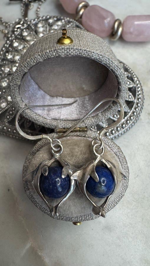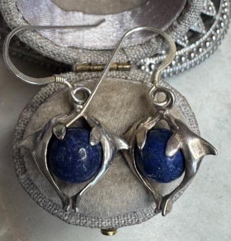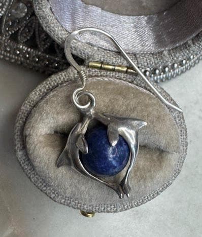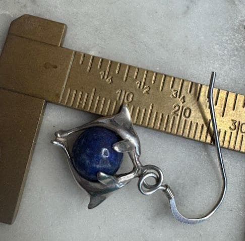 Sterling .925 Lapis Dolphin Center StonesFish Hook Earring4.59 gramsVintage, Pre-owned Condition good with minor surface wearBox shown not included, Nicely packaged with 100% recycled material