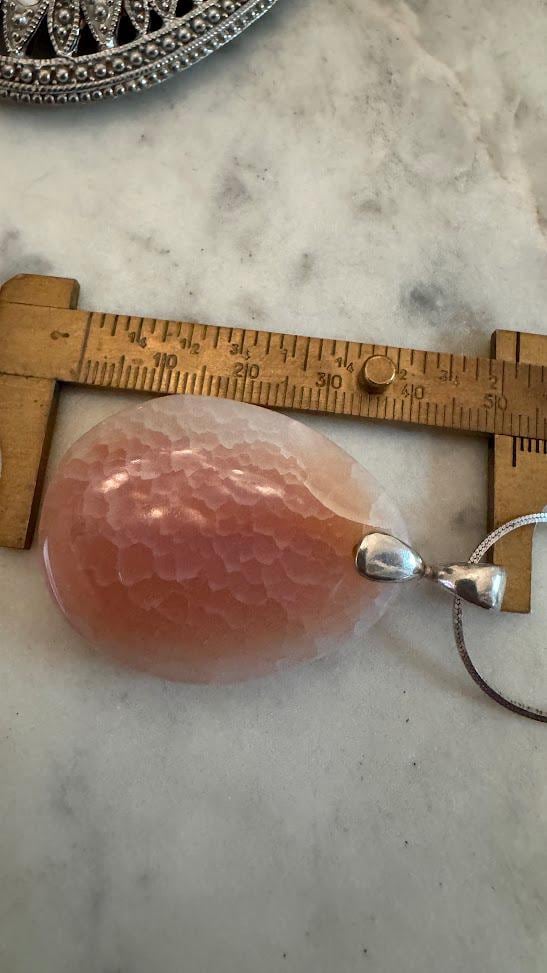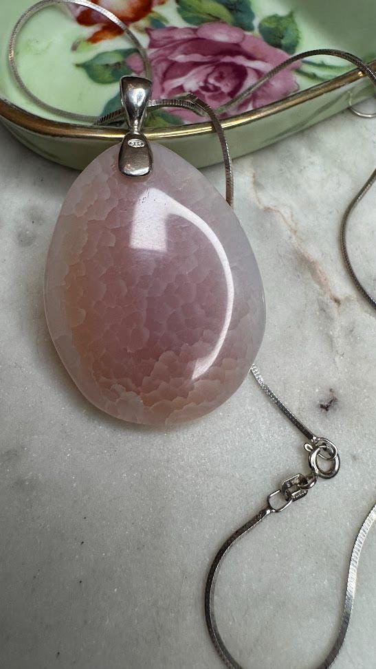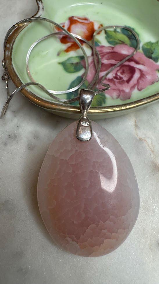 Sterling .925Large Rose Quartz Center Stone Snake Chain 18in Rhodium PlatedSpring ring clasp21.36 gramsVintage Pre-owned Condition Good with minor surface wearBox shown not included, Nicely packaged with 100% recycled material
