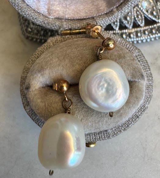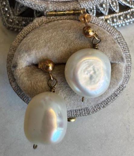 14kt Rose GoldPearl Dangle EarringsPierced earring2.65 gramsVintage Pre-ownedCondition excellent with minor surface wearBox shown not included, Beautifully packaged with recycled items