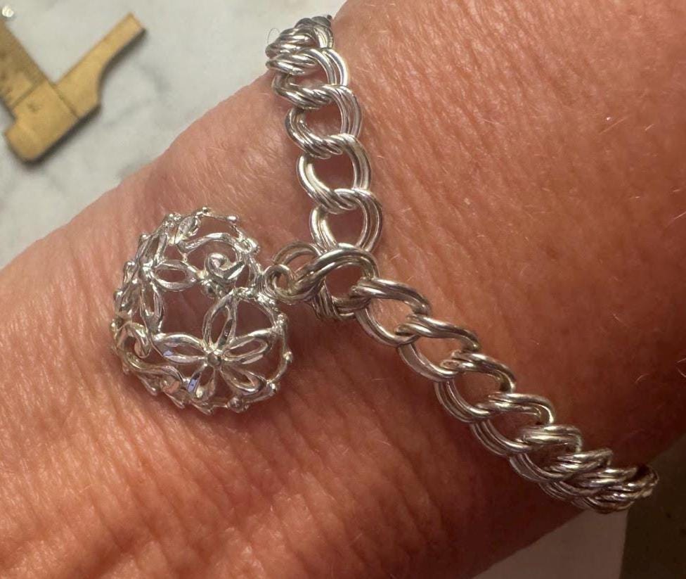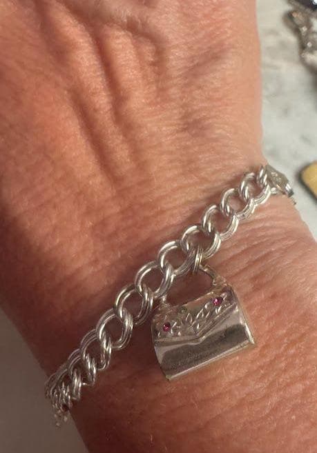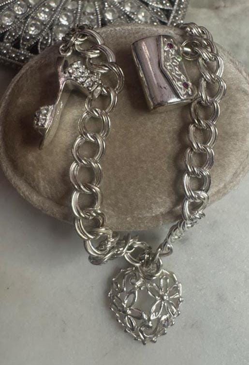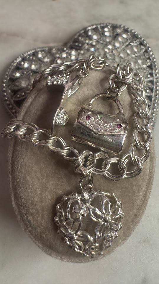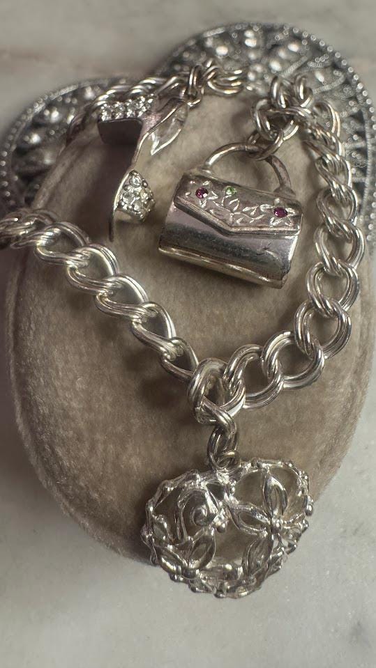 Sterling Silver .925 Rhodium PlatedFiligree Heart, Purse, Charm7in length lobster claw claspVintage, Pre-ownedCondition excellent with minor surface wearBox shown not included, Beautifully packaged