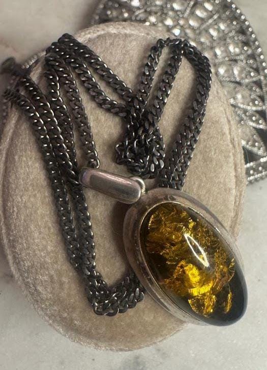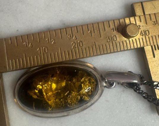 Sterling .925 Amber Center StoneBox Link chain 18in lengthSpring ring clasp15 gramsVintage Pre-ownedCondition excellent with minor surface wearBox shown not included, Beautifully packaged with 100% recycled material