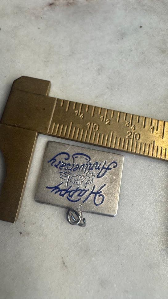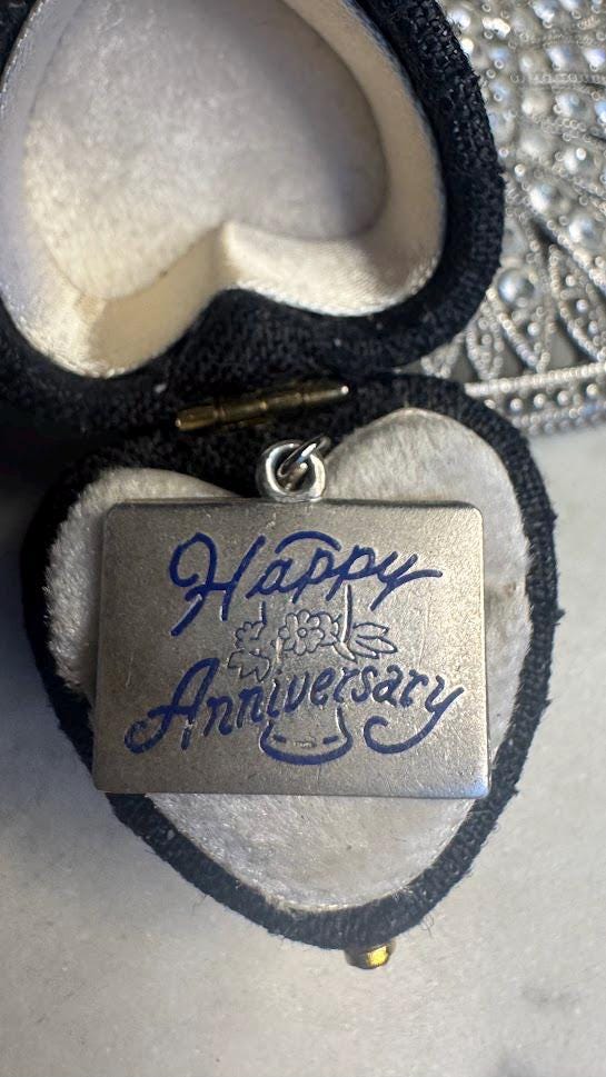 Sterling .925 Happy Anniversary Charm2.36 gramsVintage PreownedCondition good with minor surface wearBox shown not included, Nicely packaged