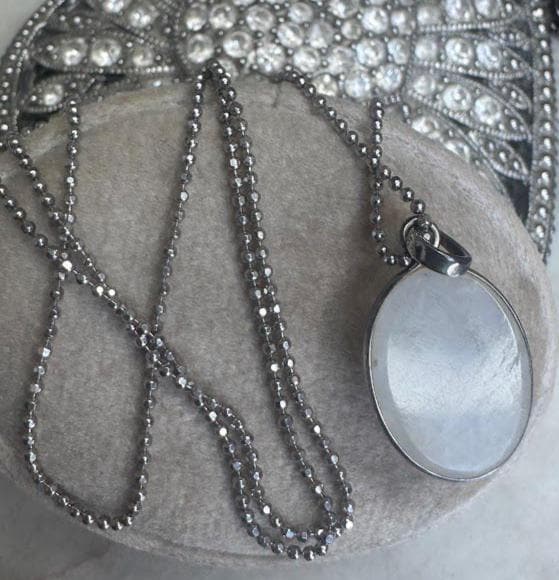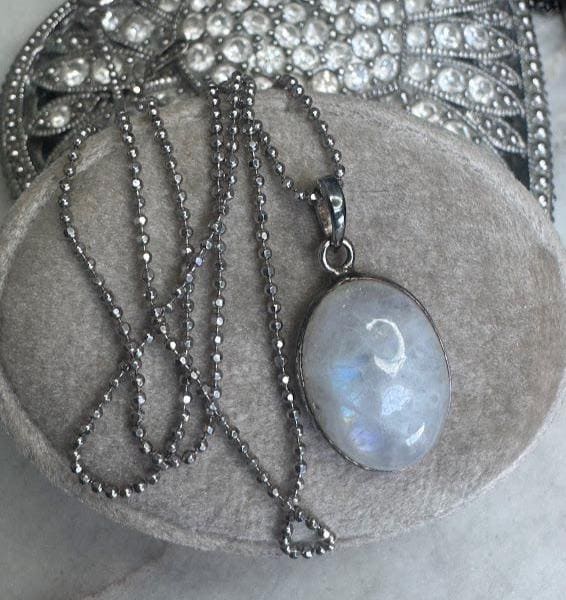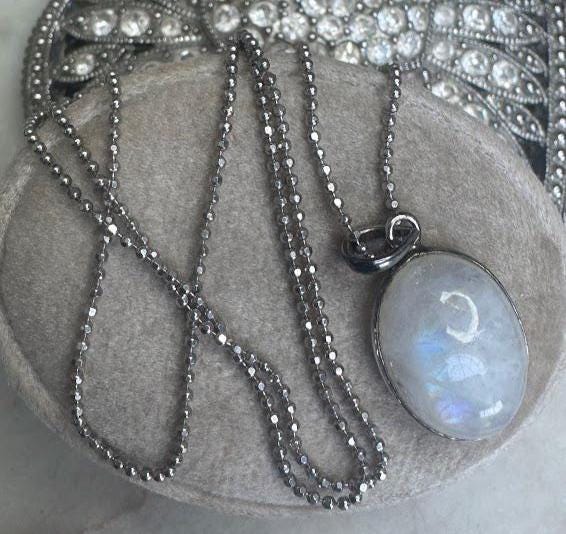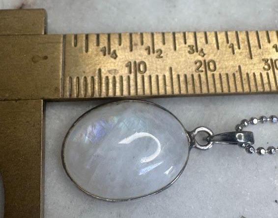 Sterling .925Oval Moonstone Center Stone Beaded chain 18inSpring ring clasp4.38 gramsVintage Pre-owned Condition Good with minor surface wearBox shown not included, Nicely packaged with 100% recycled material
