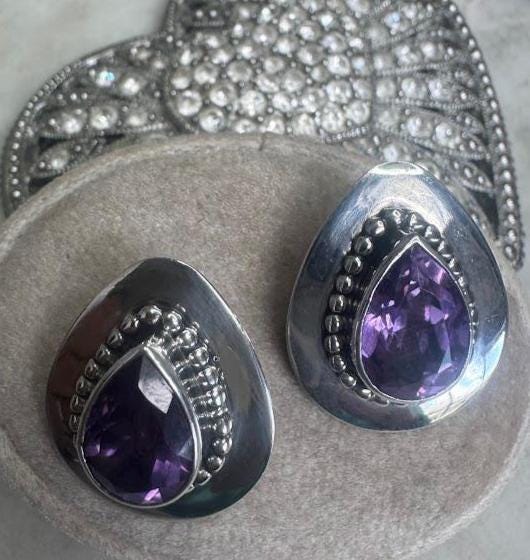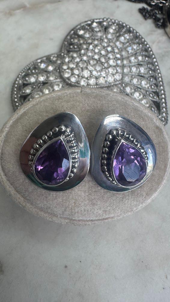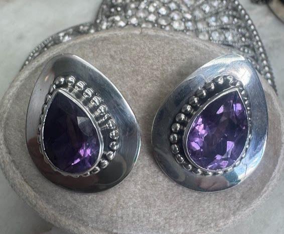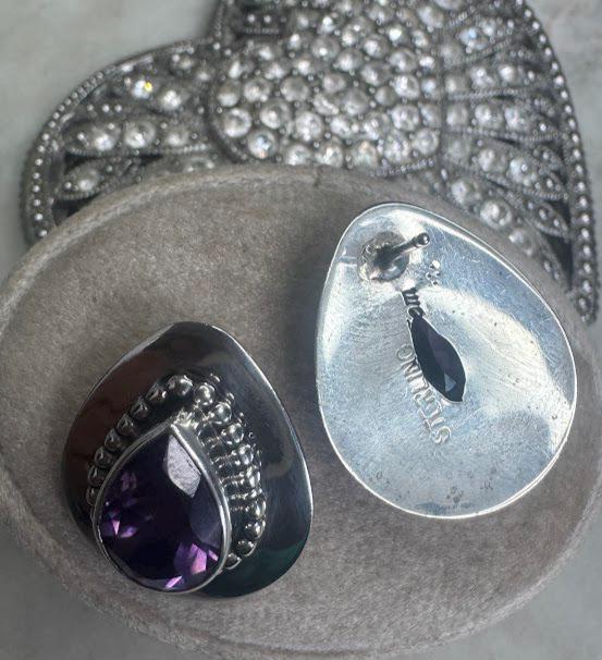 Sterling .925 Amethyst Center StonesPost Pierced Earring7.83 gramsVintage, Pre-owned Condition good with minor surface wearBox shown not included, Nicely packaged with 100% recycled material